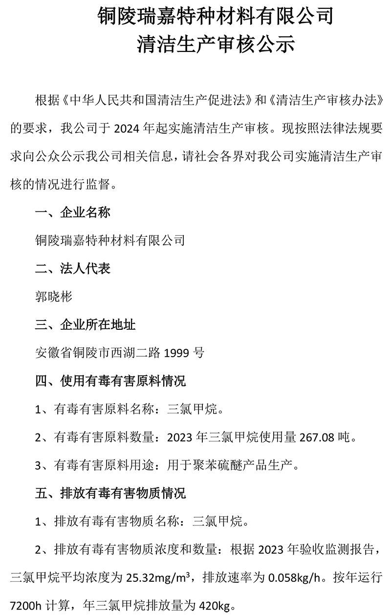銅陵瑞嘉特種材料有限公司 清潔生產(chǎn)審核公示